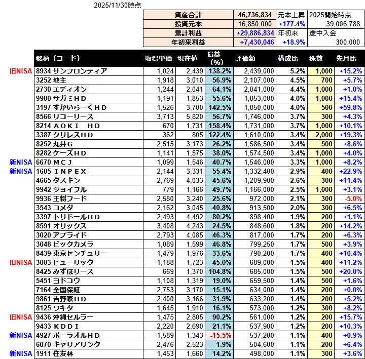 11月は積立NISA枠でオルカン、配当で現金ができたので銀行株を新たに購入しています。年末は配当多めの銘柄を買っていこうと考えていますが、保有株の中から利回りも株価の伸びもイマイチなのを入れ替えしていく予定です。毎回優待を貰っているのに使い切れていない株が一部あるので、年末に向けての大掃除として保有株の断捨離もしたいですね。