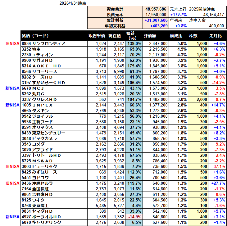 年初からの株高続きで一時は資産5000万円を達成しました。が、達成後は雲行きが怪しくなって下落してしまい、結局1月は+1%にも届かない微増で終わりました。5000万円達成したところで「富裕層の仲間入りだー」と、浮かれてステーキなど食べているうちに富裕層ではなくなってしまいました。「お前にはまだ早い!!」と白犬にワンワン吠えられている気分です。。