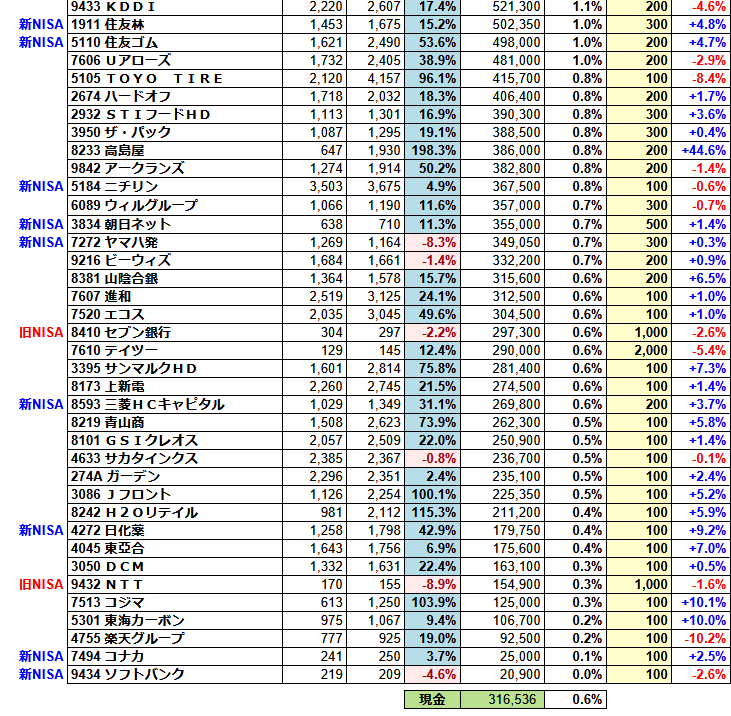 食堂優待でお世話になっていたフジオフードは、業績回復の見込みが薄いため損切りしました。毎回優待を貰えるけど株価も利回りも微妙なため、他銘柄を保有して配当貰っておくほうがマシという判断になりました。ガーデンは興味本位で買ってみましたが、握力弱めです。そしてNISA枠で保有していたオルカンを全て売却しました。確かに株価は上昇するけど、退屈すぎるためですw